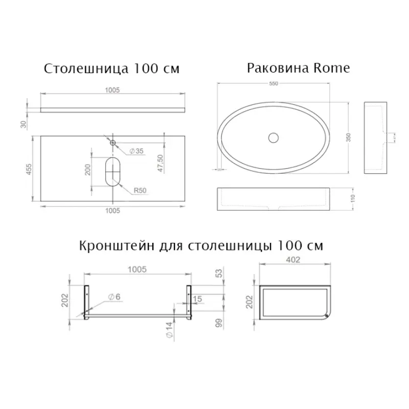 Столешница Uperwood Tanos 100 + раковина Rome + кронштейн Черный / Бук темный